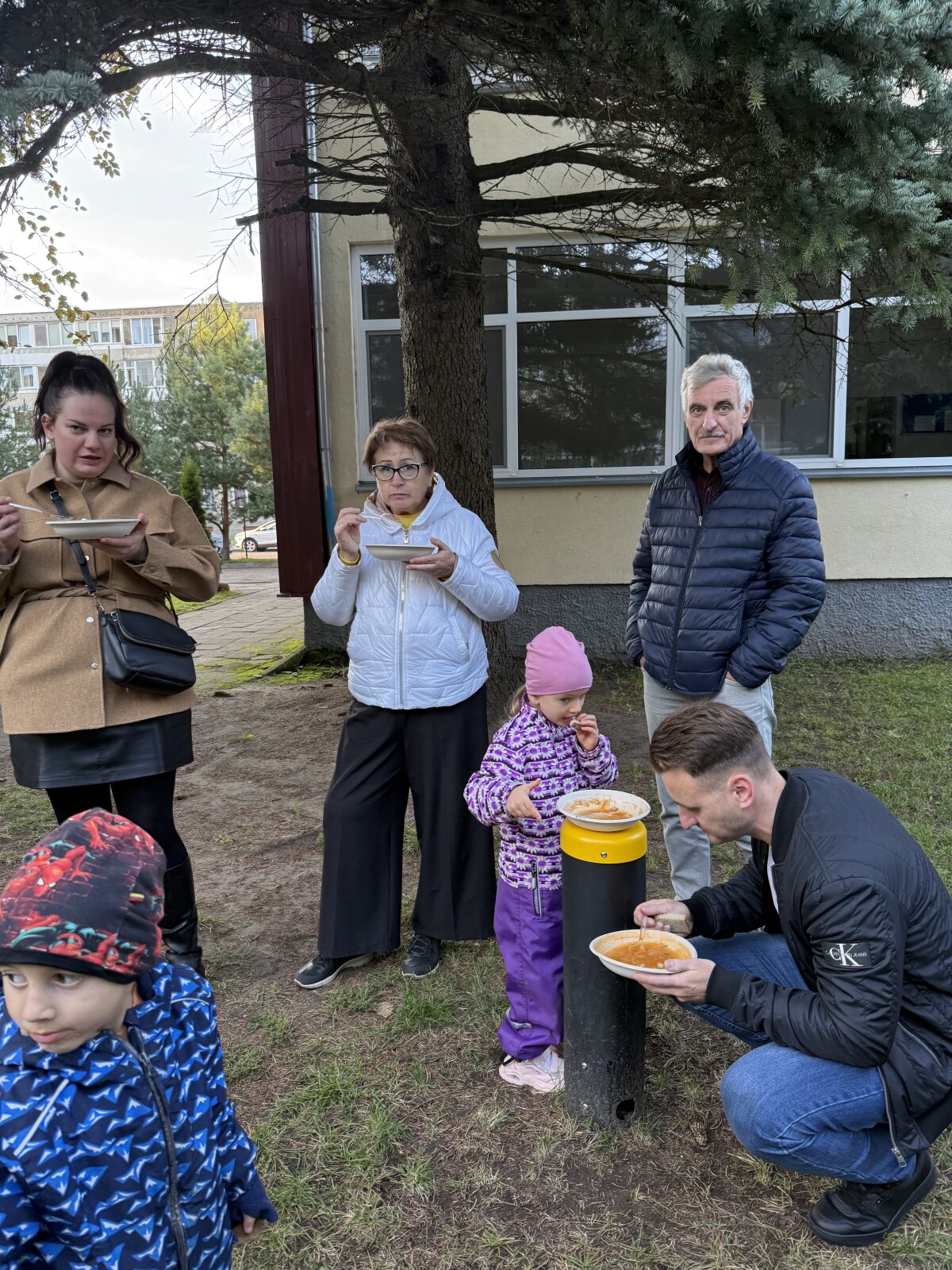 Nuotaikinga žaidimų ir užduočių popietė subūrė mažus ir didelius – vaikus, tėvelius, senelius. Visi drauge džiaugėsi bendryste, gera nuotaika ir gardžia sriuba, virta iš vaikų pačių užaugintų daržovių.